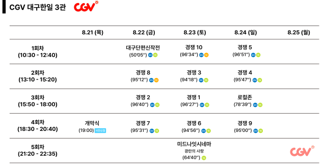 - 극장 찾기 메뉴 활용: 경상/구미 지역에서 CGV 구미를 선택하면 조력자 역할을 수행하며 오늘부터 일주일간의 시간표를 지능적으로 나열 가이드하며 명확한 시간 확인을 지원합니다.