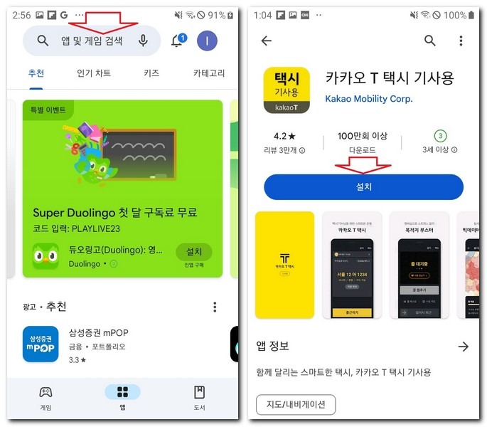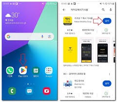 구글 플레이스토어/애플 앱스토어 접속: 검색창에 '카카오 T'를 입력하여 조력자 역할을 수행하며 지능적으로 공식 앱을 가이드하며 명확한 설치를 지원합니다.
