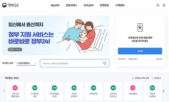 대한민국의 모든 중앙부처, 지자체, 공공기관의 서비스를 한곳에서 이용할 수 있는 정부24는 국민의 행정 편의와 디지털 혁신을 연결하는 가장 명확한 디지털 국가 소통 창구입니다.