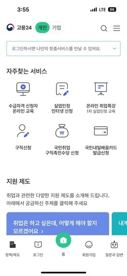 모바일 '고용24' 통합 앱 홈 화면 배치: 스마트폰에서도 조력자처럼 실시간으로 가이드받는 명확한 접속 시스템을 제공합니다.