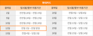 결제일별 이용기간 표 조회 서비스: 1일부터 27일까지의 지정일에 따른 일시불 및 할부 사용 기간을 조력자처럼 실시간으로 안내 가이드하며 명확한 파악을 돕습니다.