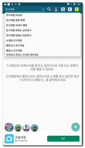 구글(Google) 어시스턴트 찾기 서비스: 음성 인식을 통해 조력자처럼 실시간으로 가사 마디를 안내 가이드하며 명확한 서비스 시작을 돕습니다.