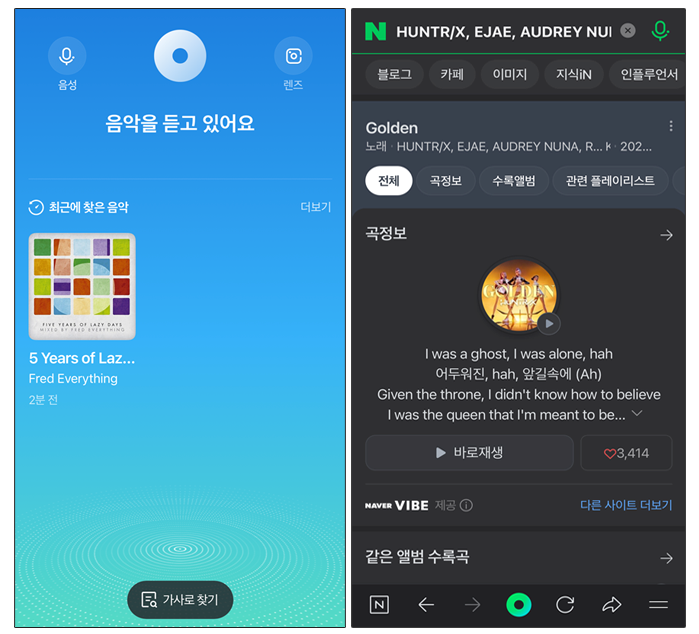 네이버 음악 검색(VIBE 연동) 접속: 검색창에 가사 일부를 직접 입력하여 조력자 역할을 수행하며 지능적으로 '곡 정보' 메뉴를 가이드하며 명확한 접속을 지원합니다.