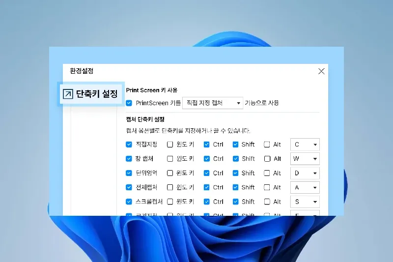 맞춤형 캡처 단축키(PrintScreen 등) 설정: 키보드 하나로 즉시 명확하게 캡처 영역을 지정하도록 조력자 역할을 수행하며 설정을 지원합니다.