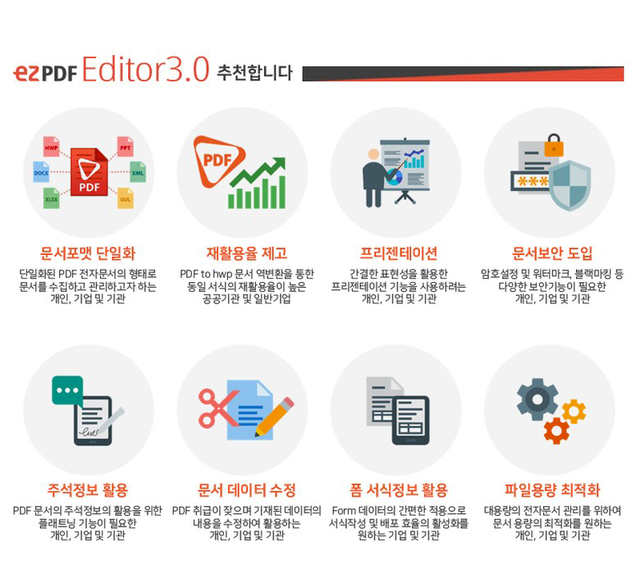 국내에서 가장 널리 사용되는 국산 PDF 솔루션인 ezPDF Editor 3.0은 사용자의 문서 작업 비전과 최첨단 전자 문서 데이터 시스템을 가장 명확하게 연결하는 디지털 오피스 소통 창구입니다.