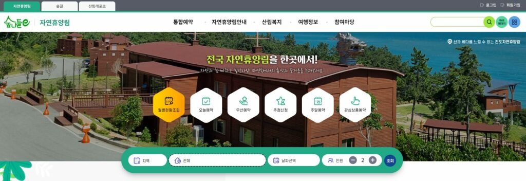 가장 먼저 전국 170여 개 자연휴양림의 빈 객실을 안전하게 확인하고 예약하기 위해 산림청에서 운영하는 공식 숲나들e 플랫폼에 접속하시기 바랍니다.
